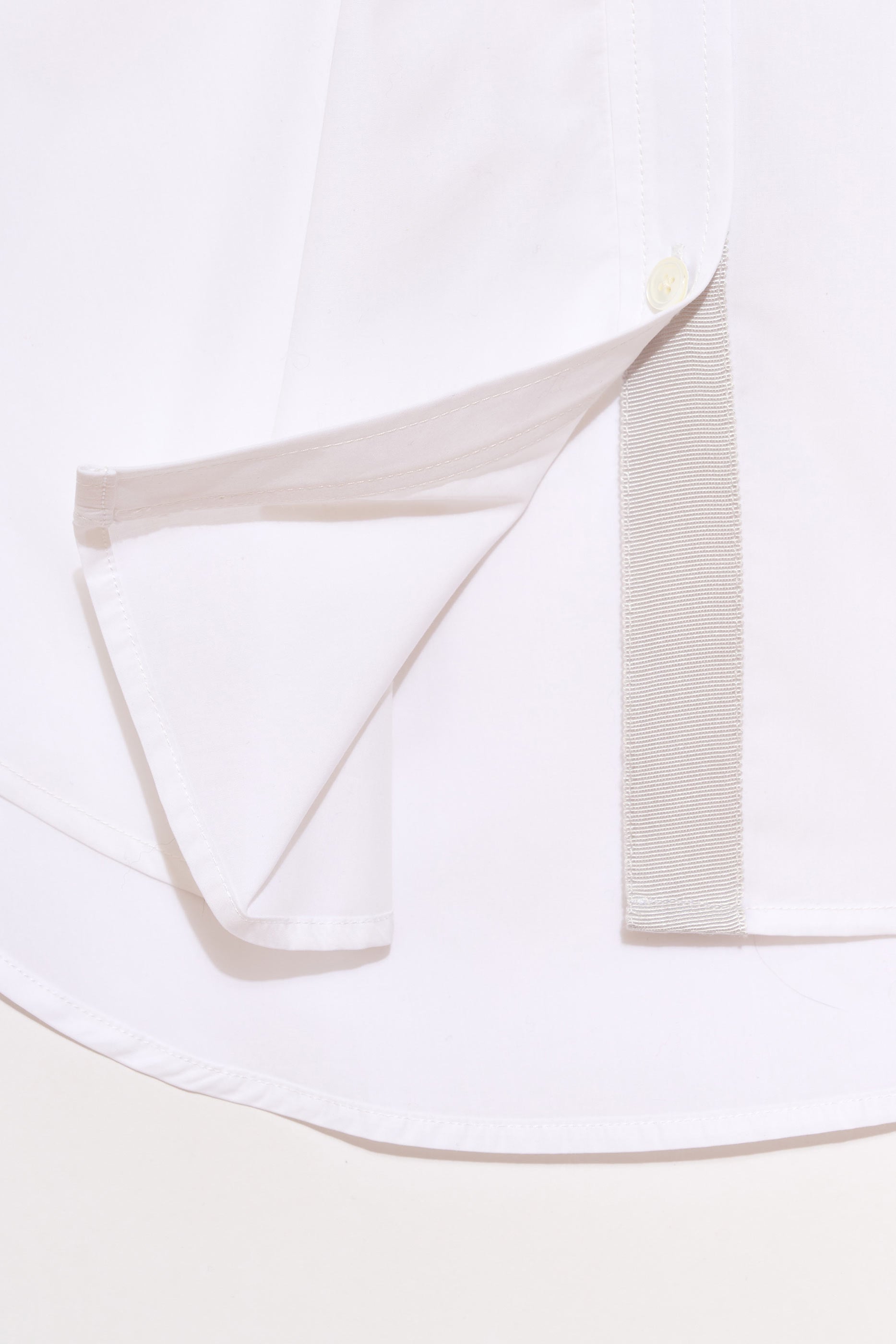 Finished with a gusseted hem reinforced with grossgrain, subtle grossgrain trim, mother of pearl button, a classic collar, and buttoned cuffs.